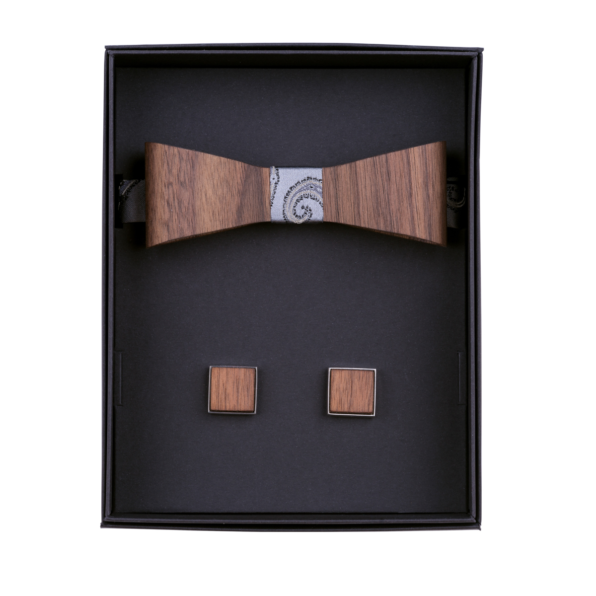 Komplekti kuulub M-suuruses käsitööna valminud 3D puidust kikilips ja puidust mansetinööbid.