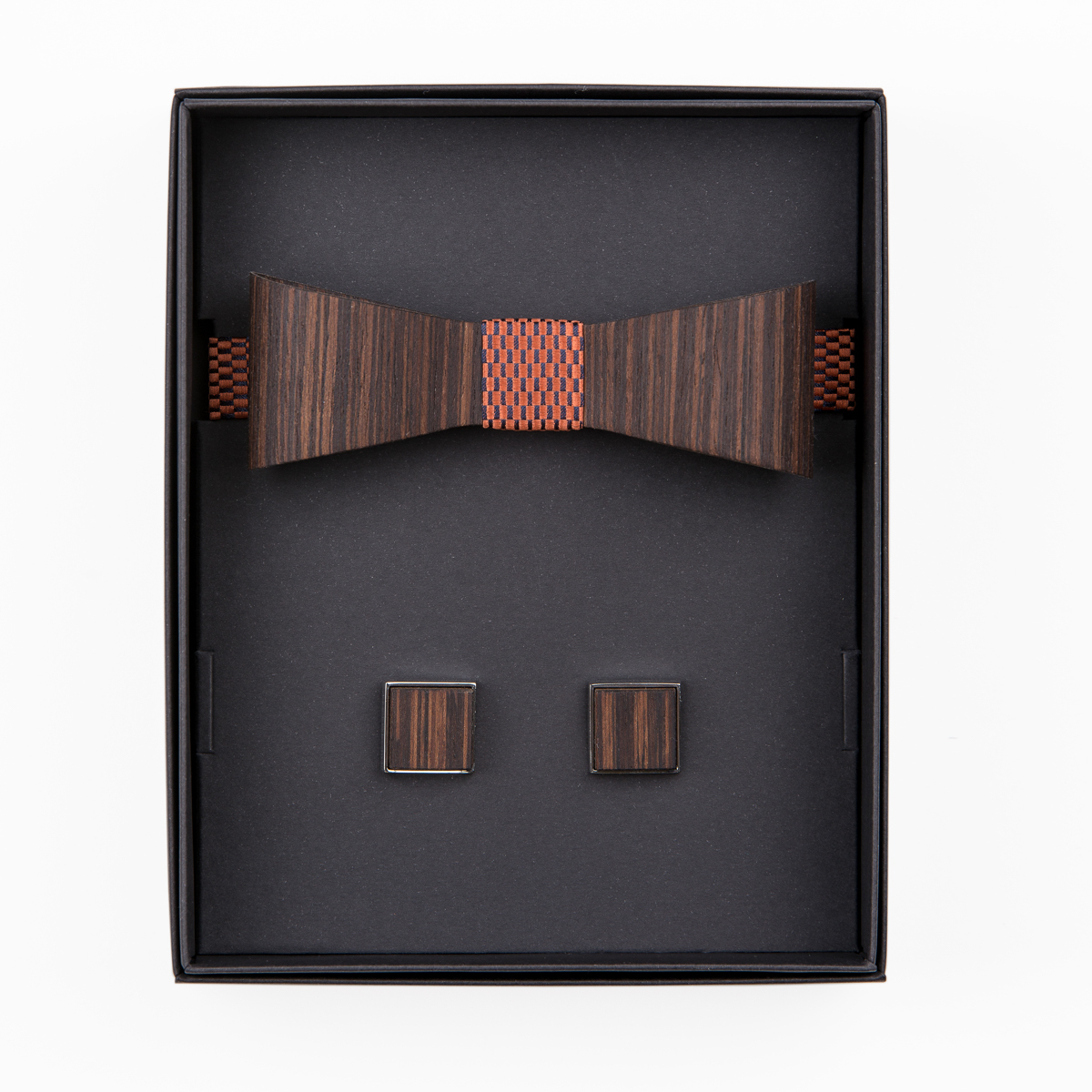 Komplekti kuulub M-suuruses käsitööna valminud 3D puidust kikilips ja puidust mansetinööbid.